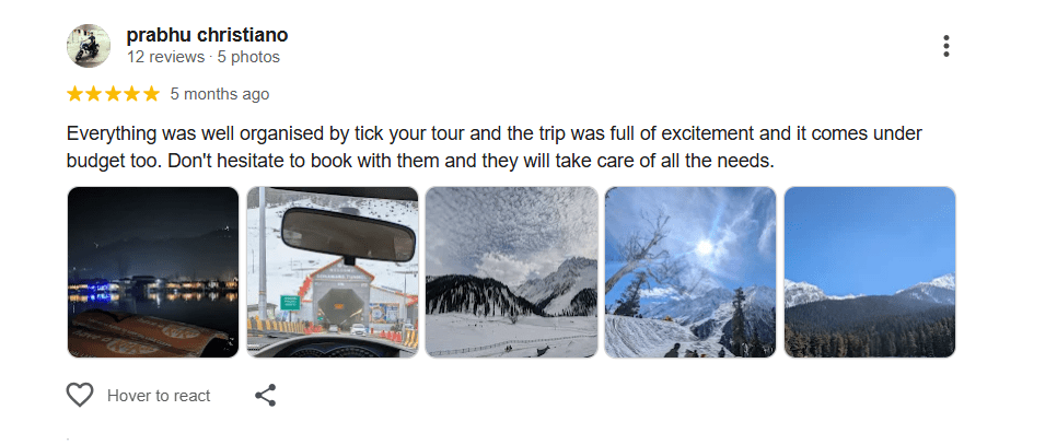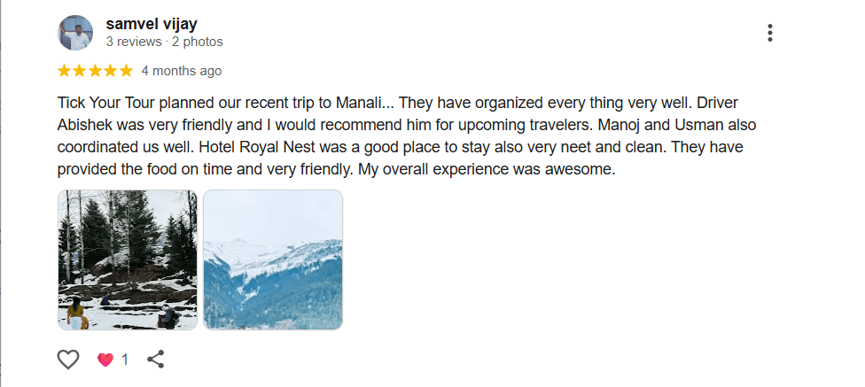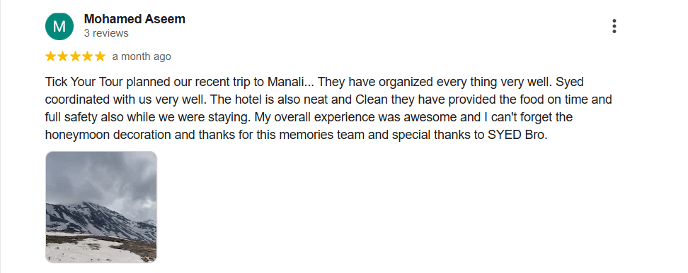 Tick Your Tour planned our recent trip to Manali... They have organized every thing very well. Syed coordinated with us very well. The hotel is also neat and Clean they have provided the food on time and full safety also while we were staying. My overall experience was awesome and I can't forget the honeymoon decoration and thanks for this memories team and special thanks to SYED Bro.